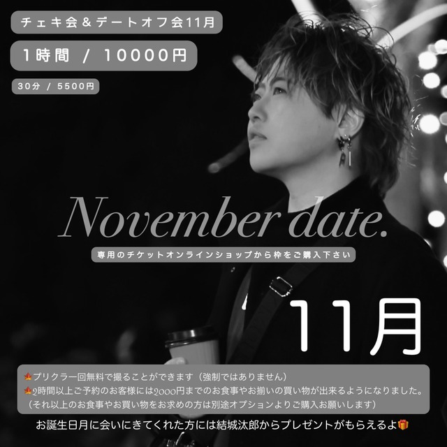 2025年11月15日(土) 結城汰郎のチェキ会&デートオフ会の枠購入ページです。 (この日可能な時間:1日の中でお客様のご都合の良いお時間の中で決めて頂くことができます) ■遠征の場合は1ヶ月前までに希望場所、希望時間を必ずご連絡下さい。